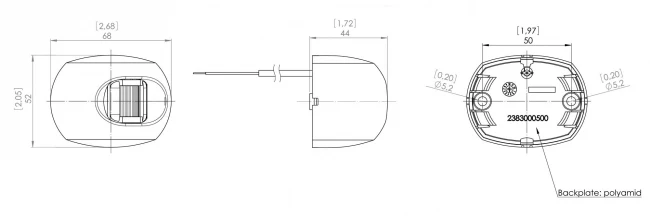 Montage: Seitenanbau, vorverkabelt mit 200 mm Kabel, 2 x 0,33 mm² / AWG 22, Zwei-Lochbefestigung