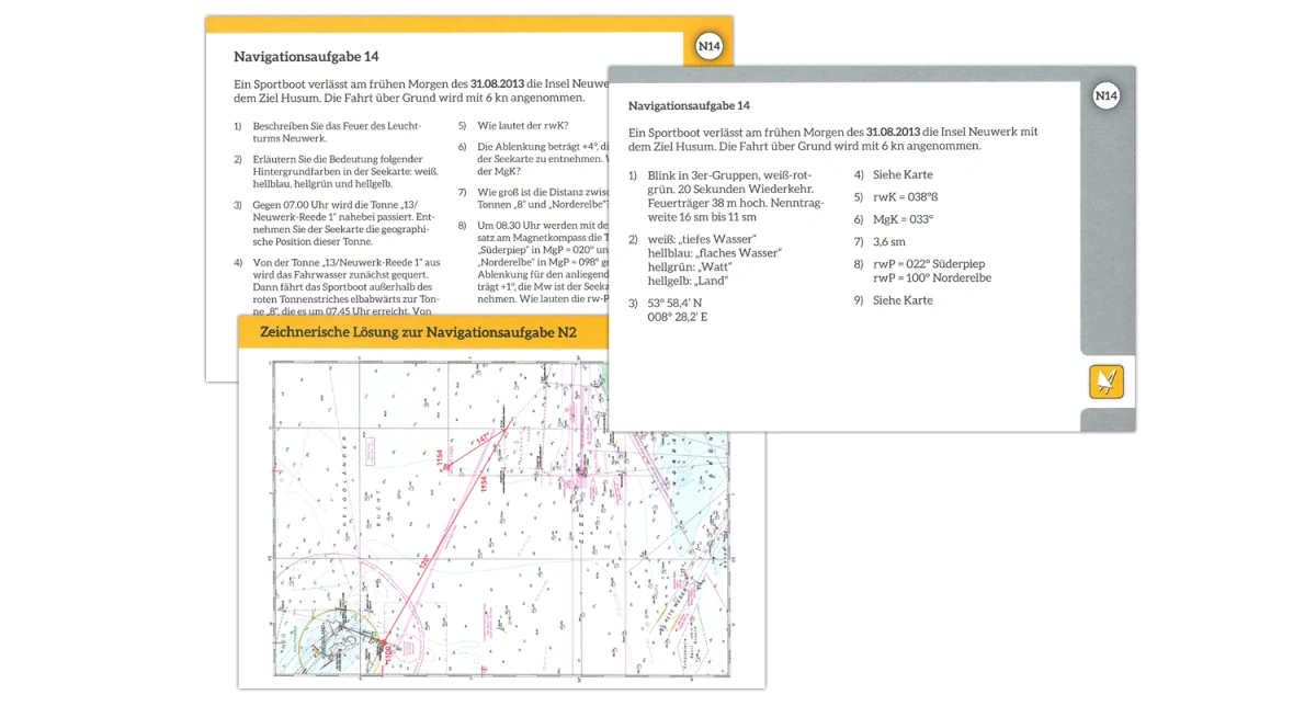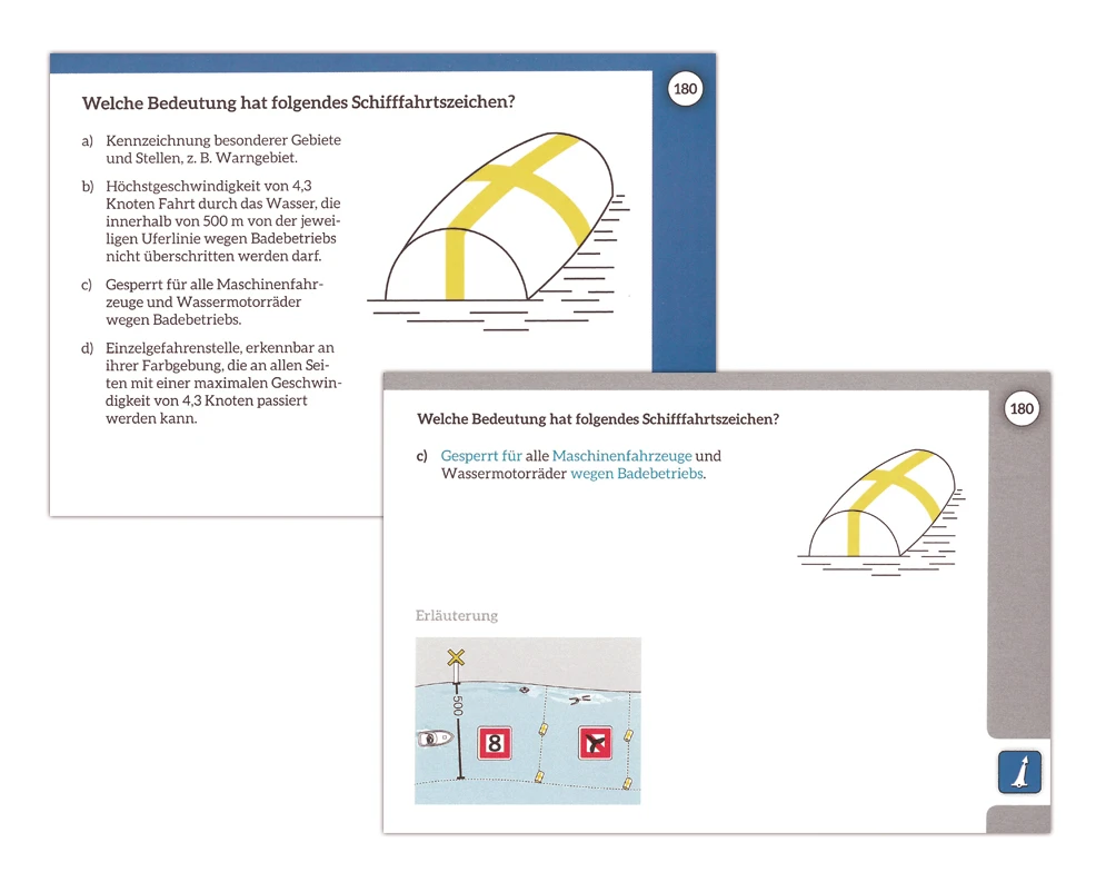 Die Karten der Memobox helfen Ihnen, gezielt und schnell einzelne Bereiche wie etwa Navigation oer Recht zu lernen: Jede Karte ist mit einem Symbol und einer Nummer versehen, sodass sie die Lernkarte schnell einem bereich zuordnen oder nach bestimmten Bereichen ordnen können. Mit dem Farbleitsystem können Sie zwischen Basisfragen (rot), spezifischen Fragen (blau) un Nvigationsaufgaben (orange) unterscheiden.