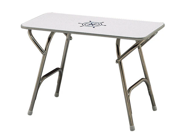 Weiße melaminbeschichtete Tischplatte mit nautischem Motiv.