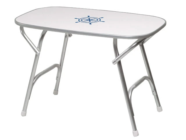 Weiße melaminbeschichtete Tischplatte mit nautischem Motiv, Untergestell Aluminium eloxiert und klappbar.
