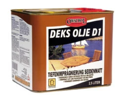 Vorteile : Nach der ersten Behandlung sehr geringer Pflegeaufwand – Keine Verseifung bei Wasserbelastung (wie z.B. bei Leinöl) – Stabilisiert Holz vollkommen – Verfestigung von altem Holz – Einfache Überarbeitung mit DEKS OLJE D2 oder 1-K-Klarlack als Hochglanzfinish