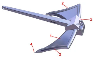 - An den Außenrändern der Flunken sind starke zugespitzte Dorne (2). Diese dringen auf hart gepresstem Sand oder auf Seegras sicher in den Ankergrund ein, ähnlich wie die Spitzen des Stockankers.