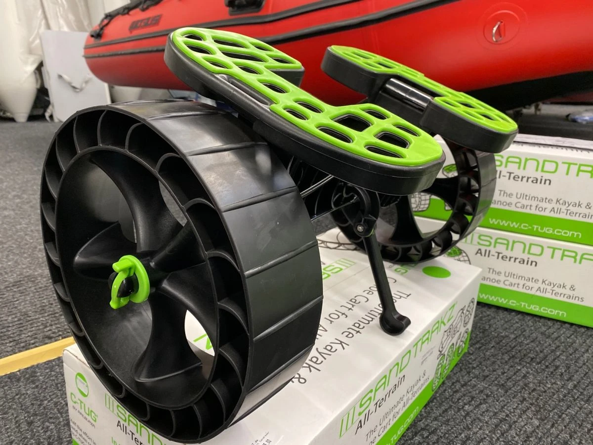 Der neue RAILBLAZA C-TUG Transport-Rollwagen mit Sandrädern ist für Kajaks, kleinere Schlauchboote, Surfbretter, SUP’s der Hit.