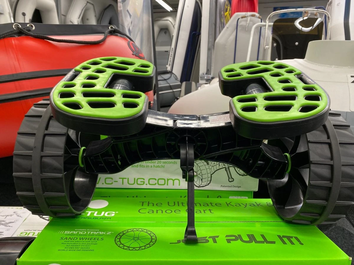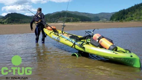 Der neue RAILBLAZA C-TUG Transport-Rollwagen ist für Kajaks, kleinere Schlauchboote, Surfbretter, SUP’s der Hit.