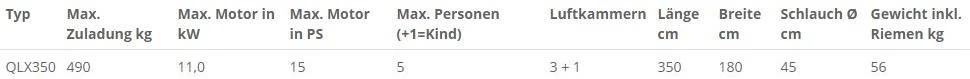 Das Talamex Aqualine QLX mit Aluminiumboden ist mit einem aufblasbarem Kiel ausgerüstet. Der Kiel sorgt für den tiefen V-Boden, der dem Boot seine perfekten Fahr- und Rudereigenschaften gibt. Der Aufbau des Aluminiumbodens erfordert zwar etwas mehr Zeit, dafür gibt der Aluminiumboden dem Boot aber große Festigkeit und Stabilität und ist nahezu wartungsfrei. Das QLX Boot ist sehr gut geeignet für Davits und als Freizeitboot.