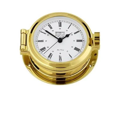 Nautik BULLAUGENUHR Massives Messinggehäuse Ø 120mm, hochglanzpoliert und farblos lackiert, Quarz Batteriewerk, Zifferblatt weiß mit röm. Zahlen.