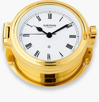 Cup MESSING BULLAUGENUHR Massives Messinggehäuse Ø 140mm, hochglanzpoliert und farblos lackiert, Quarz Batteriewerk, Zifferblatt weiß mit röm. Zahlen.