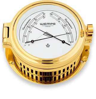 Cup MESSING COMFORTMETER Massives Messinggehäuse Ø 140mm, hochglanzpoliert und farblos lackiert, Hygro-/Thermometer, Zifferblatt weiß mit Skala % und °C/°F.