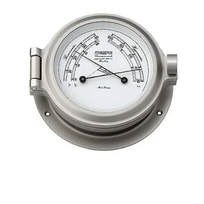 Massives Messinggehäuse Ø 120mm, matt vernickelt, Hygro-/Thermometer, Zifferblatt weiß mit Skala % und °C/°F.