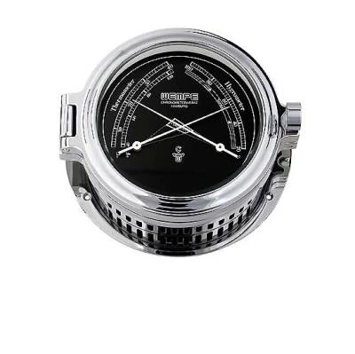 Regatta CHROM COMFORTMETER Massives Messinggehäuse Ø 140mm, hochglanz verchromt, Hygro-/Thermometer, Zifferblatt schwarz mit Skala % und °C/°F.