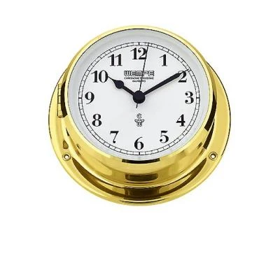 Skiff YACHTUHR, arab. Messinggehäuse Ø 110mm, hochglanzpoliert und farblos lackiert, Quarz Batteriewerk mit Wecker, Zifferblatt weiß mit arab. Zahlen.