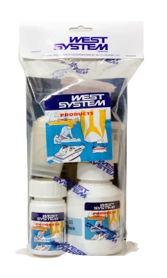 Inhalt: 250g WEST SYSTEM 105 Harz, 50g WEST SYSTEM 205 Härter 1 Döschen 402 Mischung aus gemahlenen Glasfasern, 1 Döschen 409 Mikrokugeln 1m 450g/m² 125mm breites Biaxial Glastape, 1m 175g/m² 75mm breites Glasfasertape 1m 100mm breites Abreißgewebe, 1 wiederverwendbarer Mixstab, 3 Mixbecher, 2 Spritzen, 2 Pinsel 2 Paar Latexhandschuhe, Informationsheft.